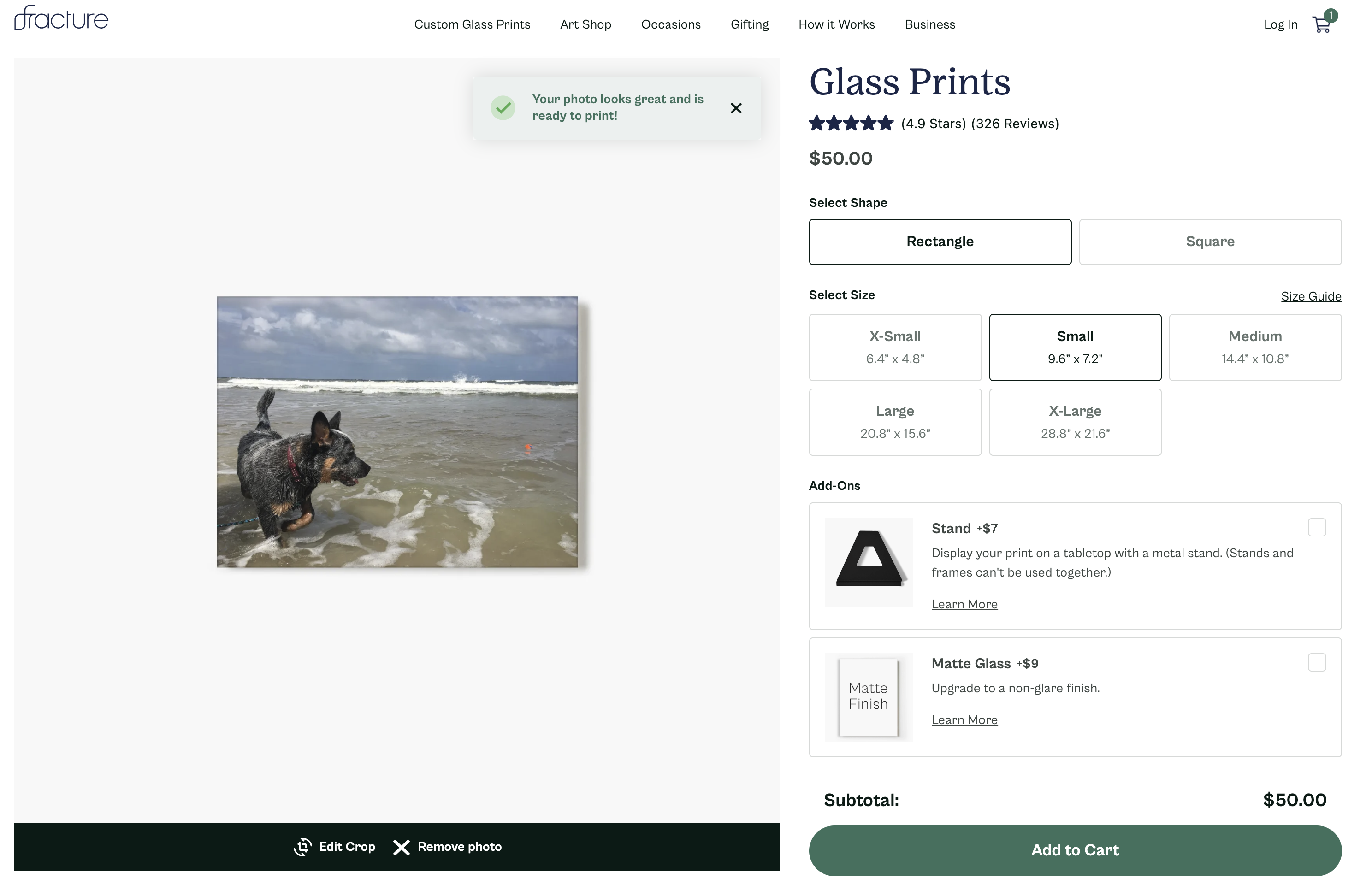 You'll see the Glass Print page reload with the Square preview. Select the print size you wish to order and add it to your Cart.