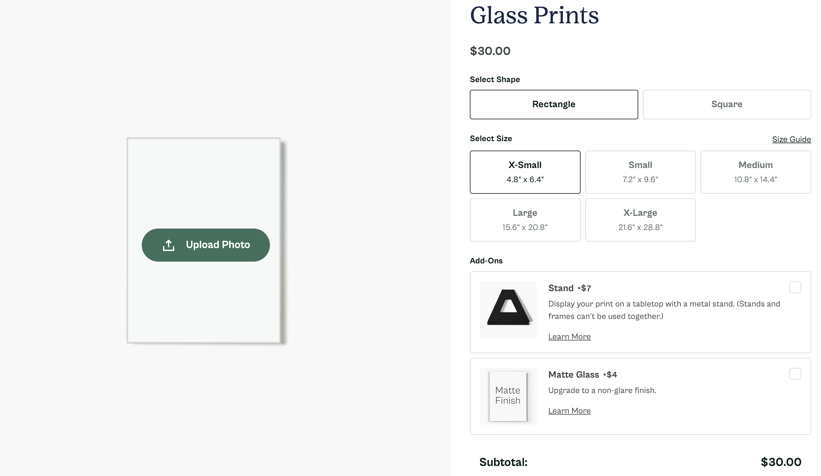 We also have Add-On options available, which you'll see below the size selection—all of our prints can be upgraded to include a Digital Border, StoryGlass, or our Matte Glass finish. Or you can add a Stand or Frame, depending on the print size you've selected.