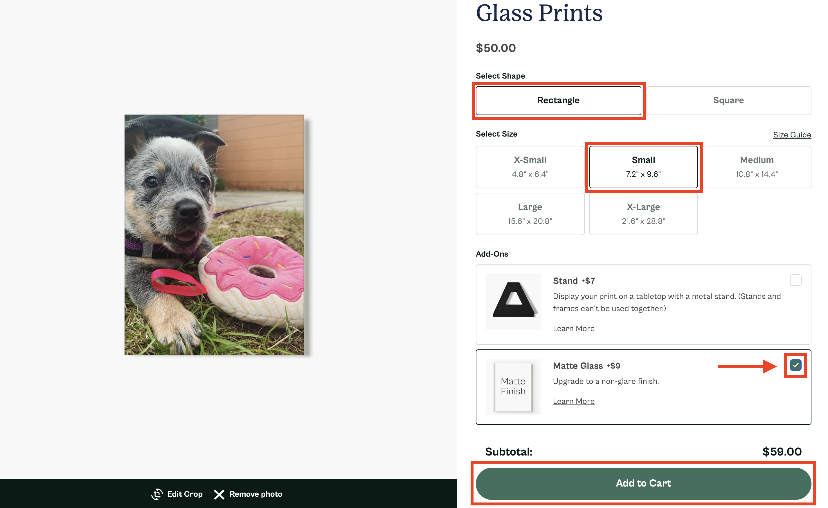 Make sure to check the box next to the options you wish to include with your print. After you've made your selections, click on the Add to Cart button to proceed: