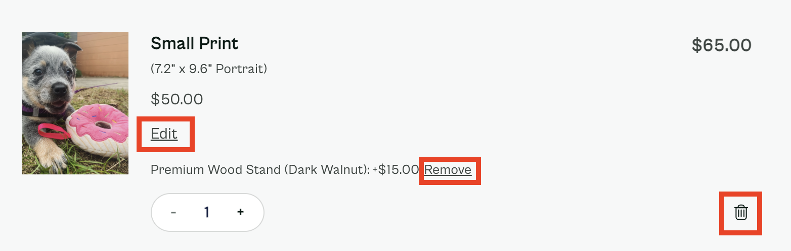 If you need to make changes to the prints already in your Cart (i.e. size, quantity, or the photo itself), you can click the 'Edit' button just under each item. Or, you can 'Remove' a Stand, or delete the entire print by clicking on the trash can button: