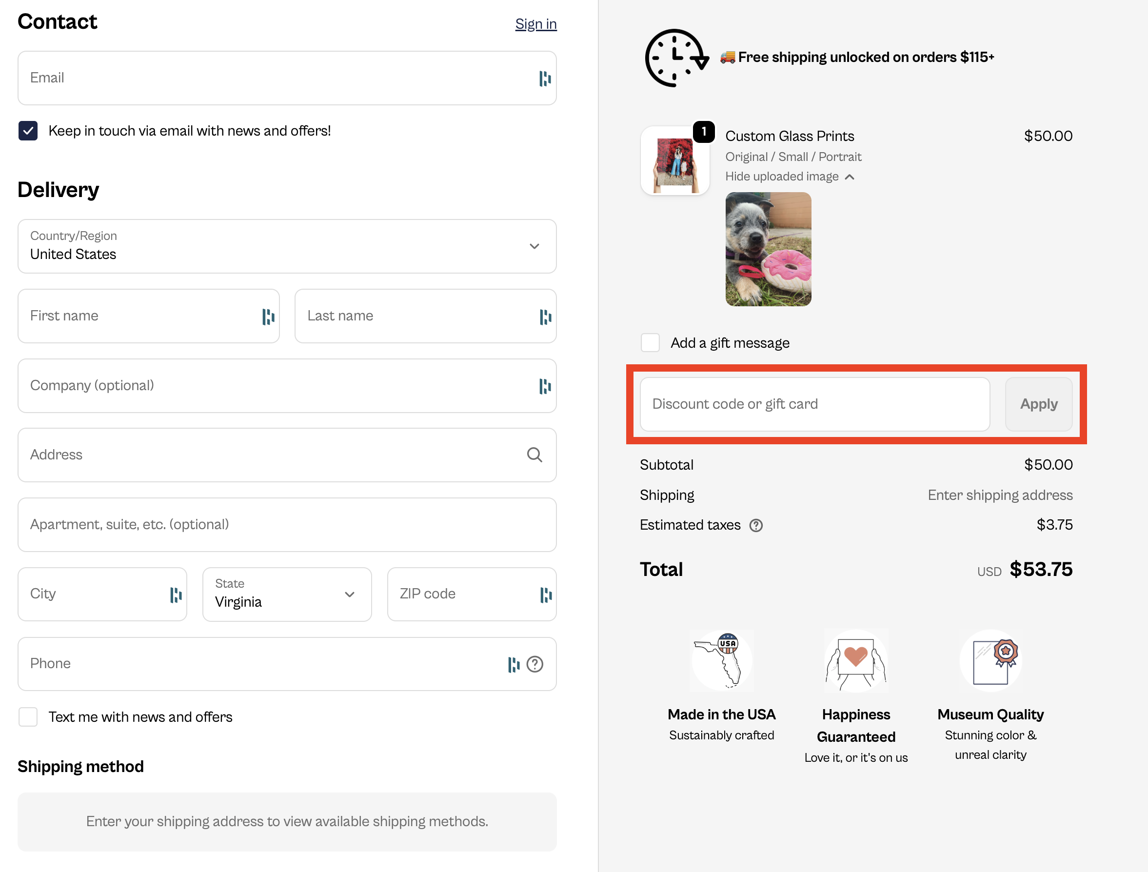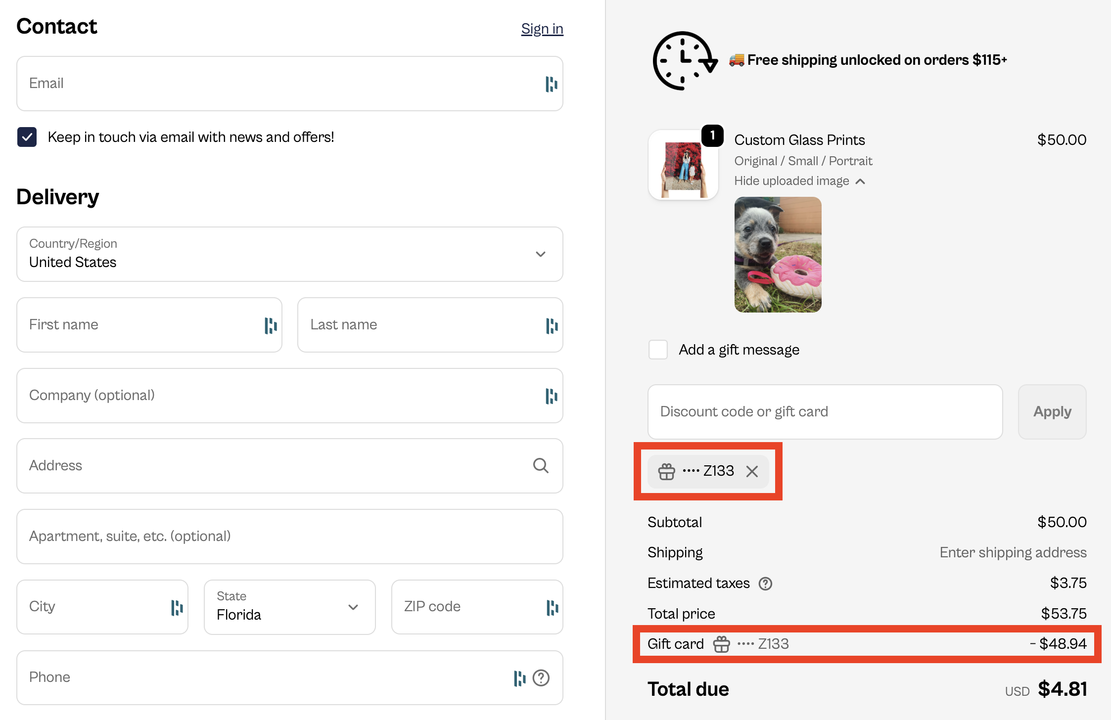 After typing in your code, the "Apply" button will then turn green—don't forget to click "Apply". Then you'll see the Gift Card balance apply to your order's total: