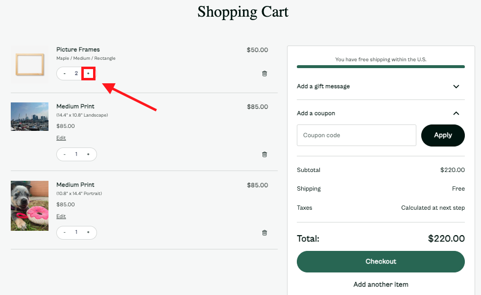 Proceed to the Cart page to view all of the items you're purchasing. If you wish to order multiple frames of the same size/color, you can use the [+] button to increase the quantity of an item in your Cart.