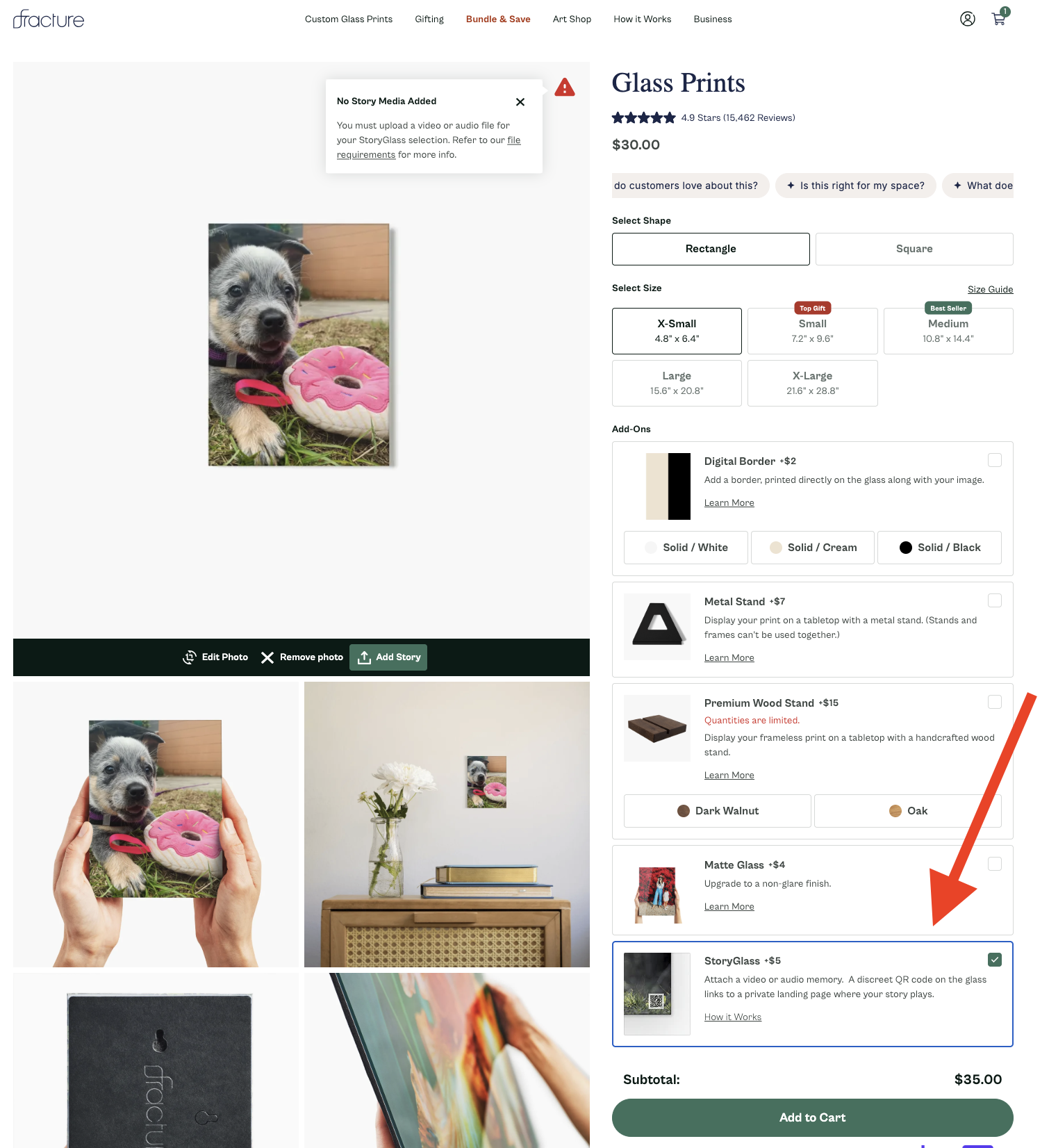 StoryGlass is an add-on feature that allows you to attach a short video or audio file—a toast, a laugh, a lullaby—to your print using a QR code printed directly on the glass. This code will be 3/4 of an inch wide (on all print sizes), and you can select either of the four corners to have it printed.