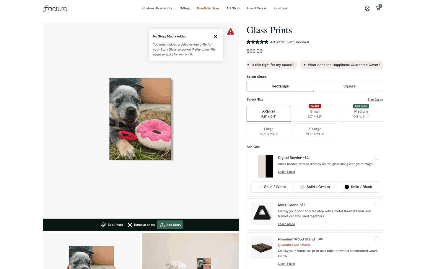 - You'll be taken back to the Glass Prints page of our site, where you can add any additional items to your print (like a Stand or Frame). When you're ready, click Add to Cart to proceed with your order.