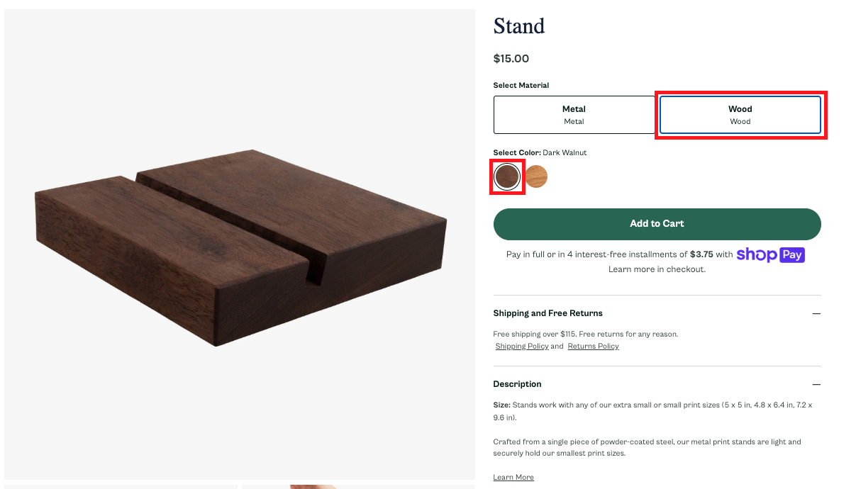 Select the Metal or Wood option that you wish to purchase. If you select the Wood Stand, you can choose between the Dark Walnut and Oak colors.