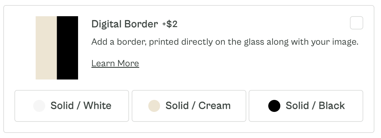 Digital Borders allow you to add a border to your image, like a photo mat but digital. Borders are even all the way around and range from ½" on our smallest size to 2 ¾" on our largest size. When you add a digital border and select a color, you'll see your preview image update.