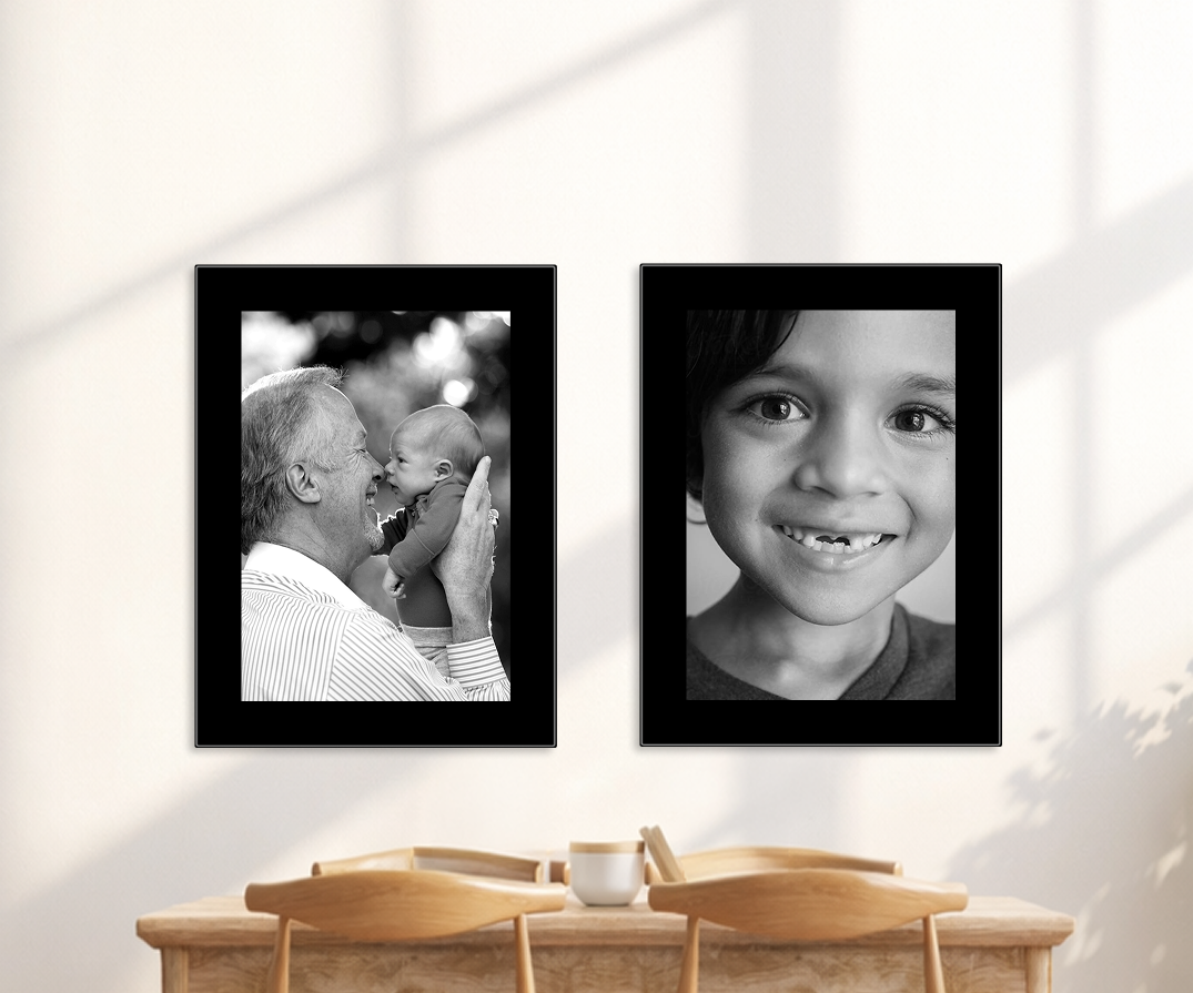 This approach works especially well for family portraits, formal photography, or gallery walls that mix modern and traditional elements. You get the classic feel of a framed, matted print, but with all the benefits of glass.