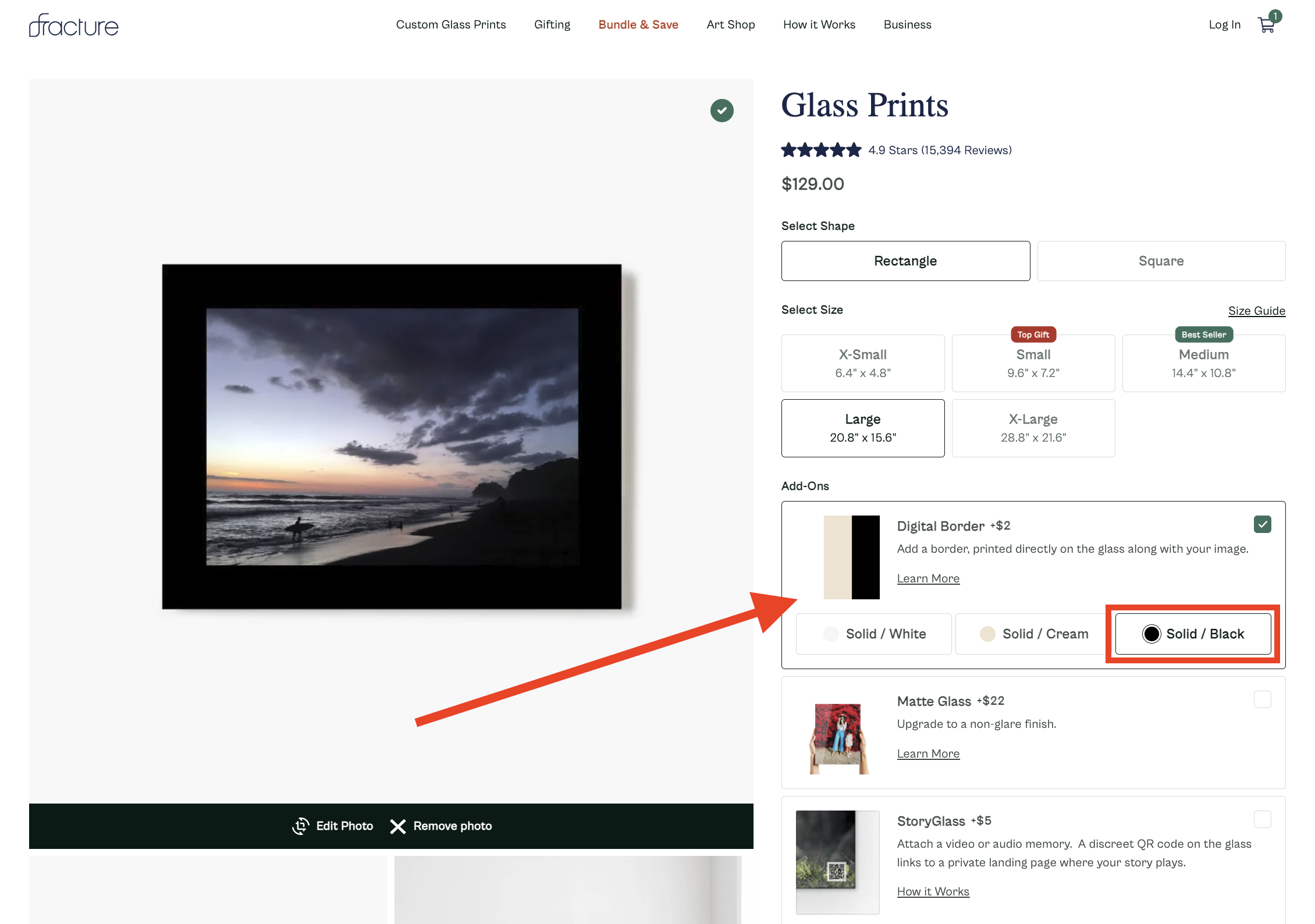 Locate the 'Digital Border' option from the list of add-on items, and click on the color you wish to purchase. You'll see the border added to the preview of your print: