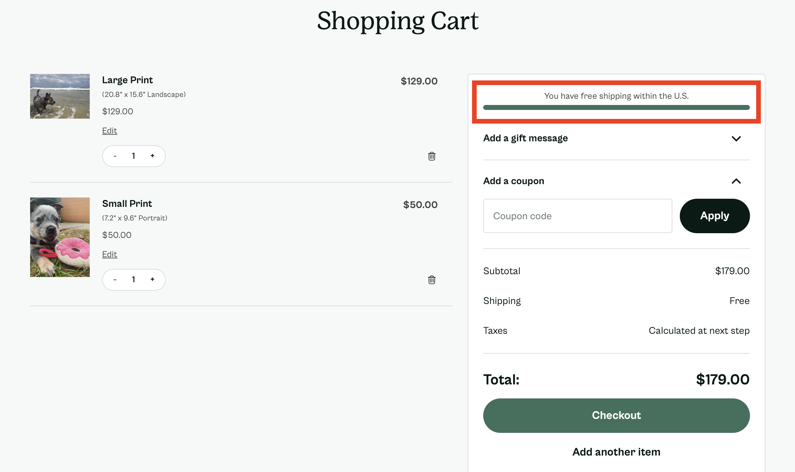 Most of the time, our promotions will have a minimum spend threshold that must be met before the free shipping offer can be applied. As you fill your Cart with items, the green bar at the top of the Cart Page will update to let you know how close you are to qualifying for free shipping: